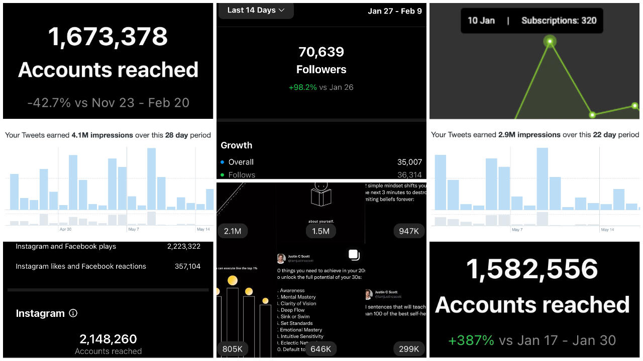 I don’t expect you to just take me at my word.So here’s just a few examples of the proof I have to backup my claims...100% organic impressions, followers gained, & single day email opt-ins. None of these metrics are artificial, inflated, or propped up - just the result of knowing how to consistently create easily shareable & deeply resonate content:
