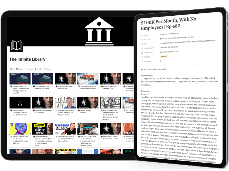 Get lifetime access to my own personal knowledge curation hub, where I add the best highlights and insights from what I’m reading, watching, and listening to from books, articles, youtube videos, podcasts, and twitter threads. Auto-updates every week. (cohort only)